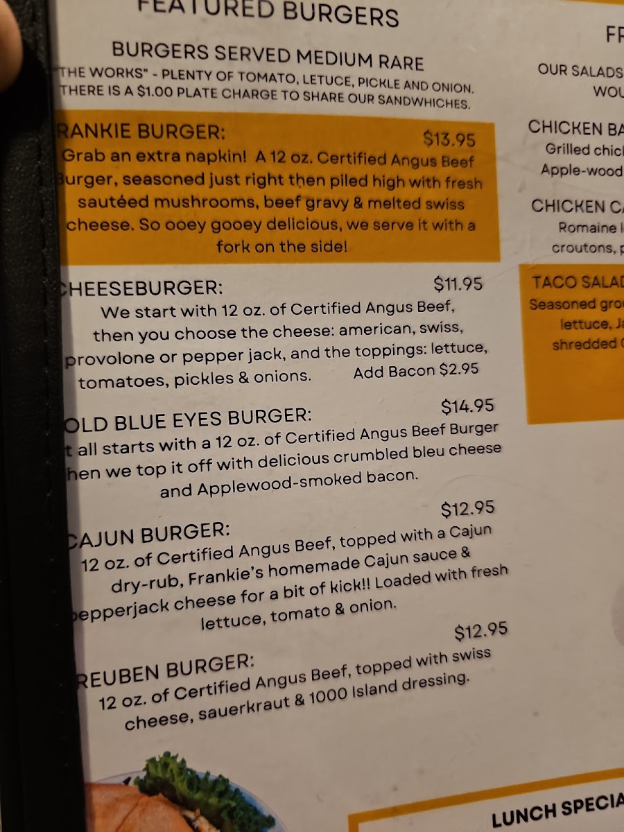 12 ounces of certified Angus beef, topped with a cajun dry-rub, frankle's homemade cajun sauce and Pepper Jack cheese for a bit of kick! Loaded with fresh lettuce, tomato and onion.